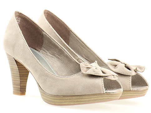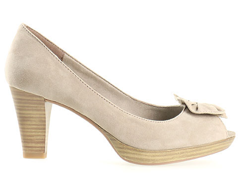 Дамски обувки на висок ток Marco Tozzi в бежов цвят. Моделът е изпълнен във висококачествен и лек текстил. Ходилото е с плавна извивка и стабилен 7,5 см ток. За повече комфорт е добавена 1,5 см платформа. Дизайнът е решен с нежна панделка, която придава закачлива визия на обувките. Грабнете погледите с този уникален модел Marco Tozzi!